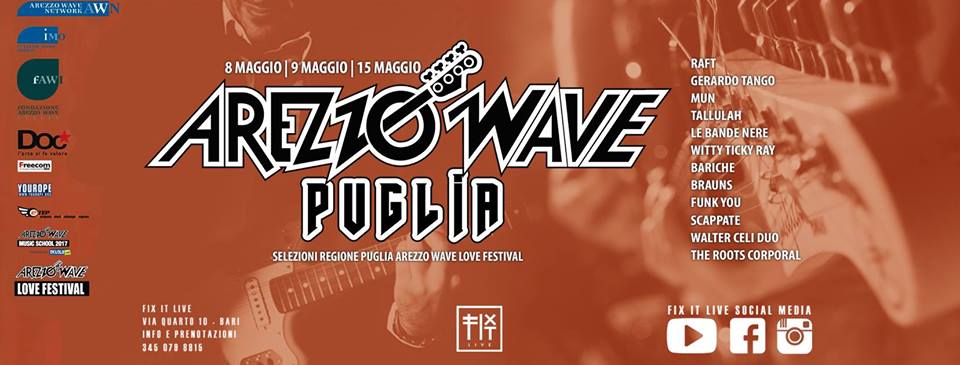 Domani sera dalle 22:00 sul palco del FixIt Live si sfideranno le prime cinque band baresi selezionate per il concorso Arezzo Wave Band 2018: BARICHE, BRAUNS, LE BANDE NERE, TALLULAH, WITTY TICKY RAY. Mercoledì 9 e martedì 15 maggio si svolgeranno invece le altre due serate, che porteranno la giuria ad eleggere un vincitore provinciale, la band che rappresenterà le province di Bari e Bat nella finale regionale.